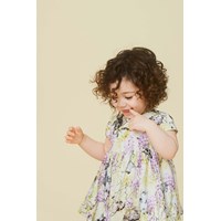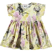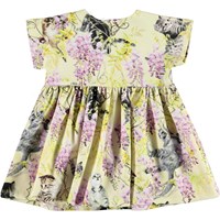 Channi är en ljusgul ekologisk klänning med kattungar som leker i blåregn. Channi har en bred passform och tryckknappar på axlarna som gör den enkel att ta av och på.
