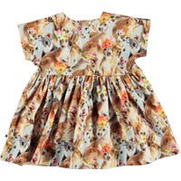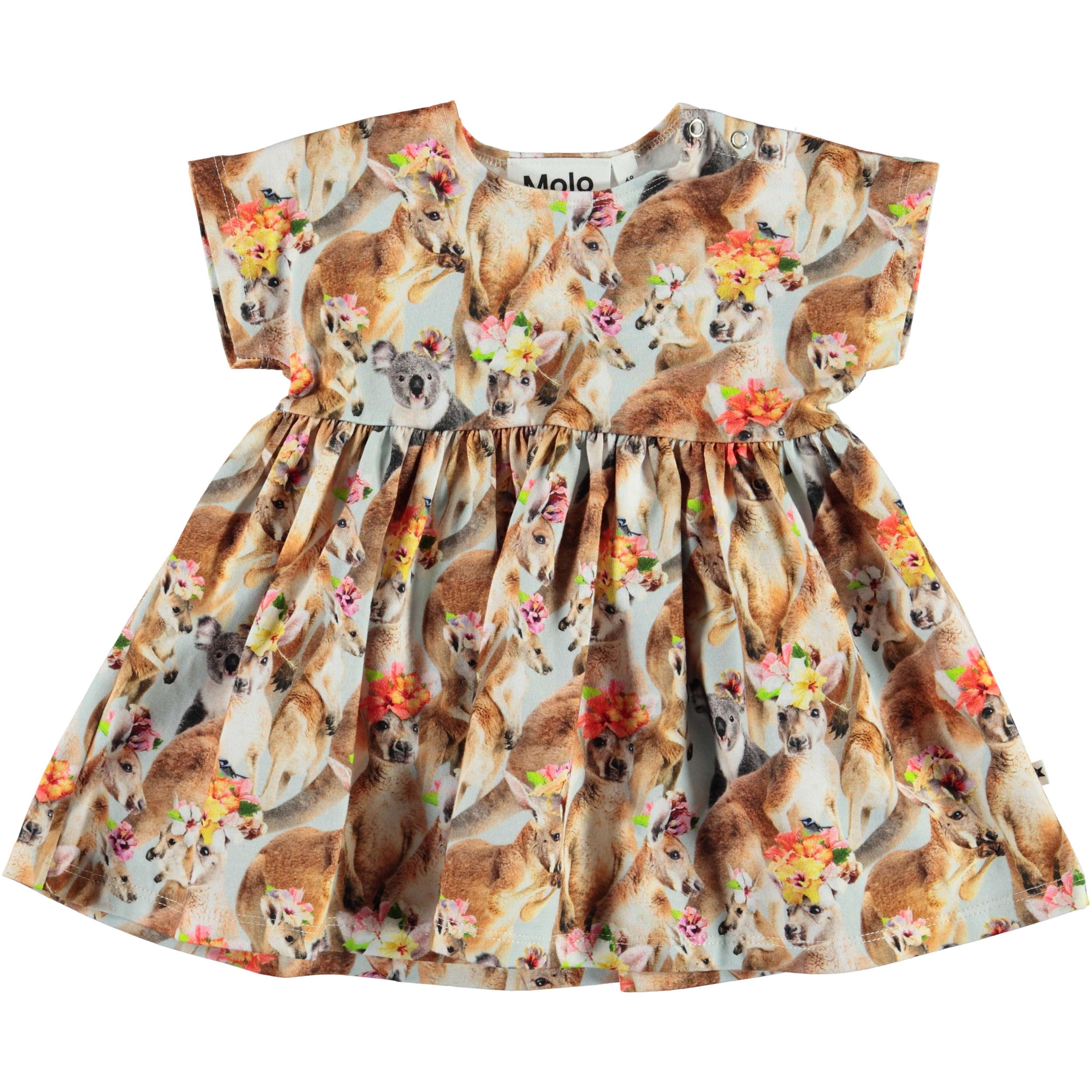Channi är en baby klänning med tryck av kängurur och panda med blommor på huvudet. Channi har en bred passform och tryckknappar på axlarna gör den lätt att ta av och på.