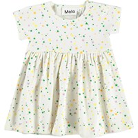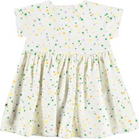 Channi är en vit babyklänning med små stjärnor i olika färger. Channi har en bred passform och tryckknappar på axlarna gör den enkel att ta av och på.