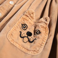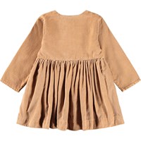 Ljusbrun klänning för de små i mjuk ekologisk bomullssammet. Klänningen har en lös passform och en vid kjol med volym. Klänningen har en fin knäppning och två små fickor framtill, formade som små hundar.