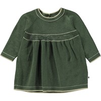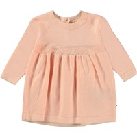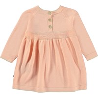 Rosa stickad babyklänning med långa ärmar. Klänningen har en bred passform och knappar i nacken.