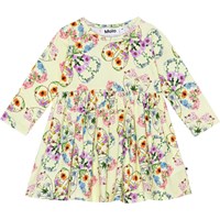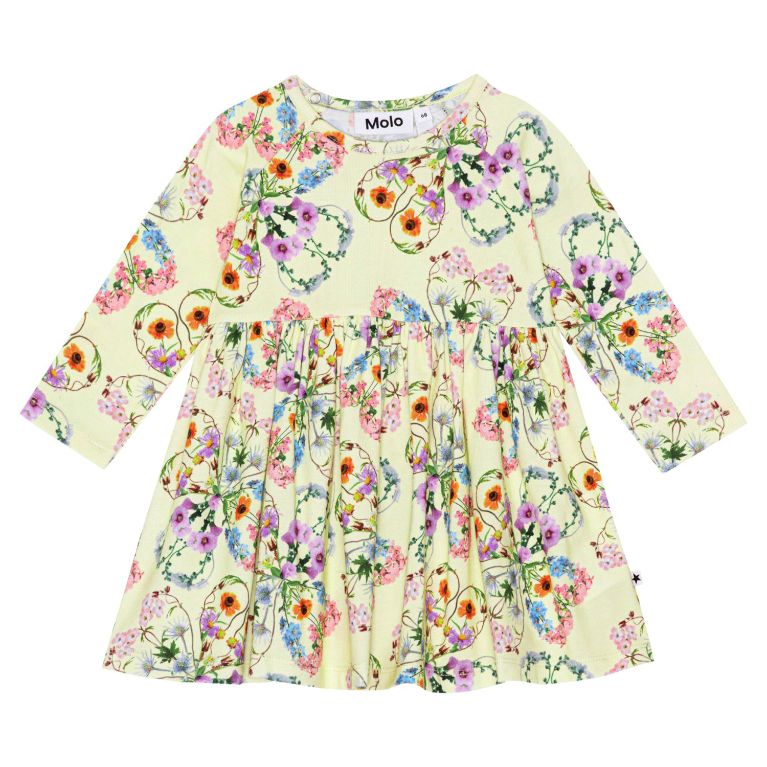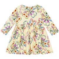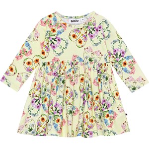 Ljusgul ekologisk klänning med mönster, till baby. Mönstret består av olika färgrika blommor som bildar både hjärtan och klöver. Klänningen har en rund hals, tryckknappar, långa örmar och rundad kjol.