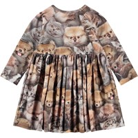 Långärmad klänning för de små i ekologisk bomull. Klänningen är brun med hundar och katter. Toppen har en smal passorm med rund halsringning och en knäppning i ryggen för att göra den lätt att ta på sig.