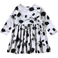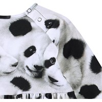 Långärmad klänning för de små i ekologisk bomull. Klänningen har ett sött pandamönster. Toppen har åtsittande raglanärmar och en rund halsringning med knäppning i ryggen, vilket gör den lätt att ta på sig. Kjolen har veck som möjliggör rörelse och gör den bekväm att bära.