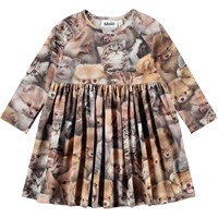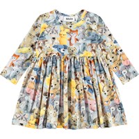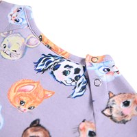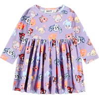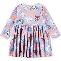 Långärmad klänning för de små i ekologisk bomull. Klänningen är lila med ritade djur. Toppen har en smal passform med rund halsringning och en knäppning i ryggen för att göra den lätt att ta på sig.