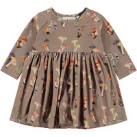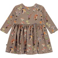 Beige babyklänning med olika svampar. Klänningen har låga ärmar och en kjol med fin volym, samt tryckknappar på ena axeln.
