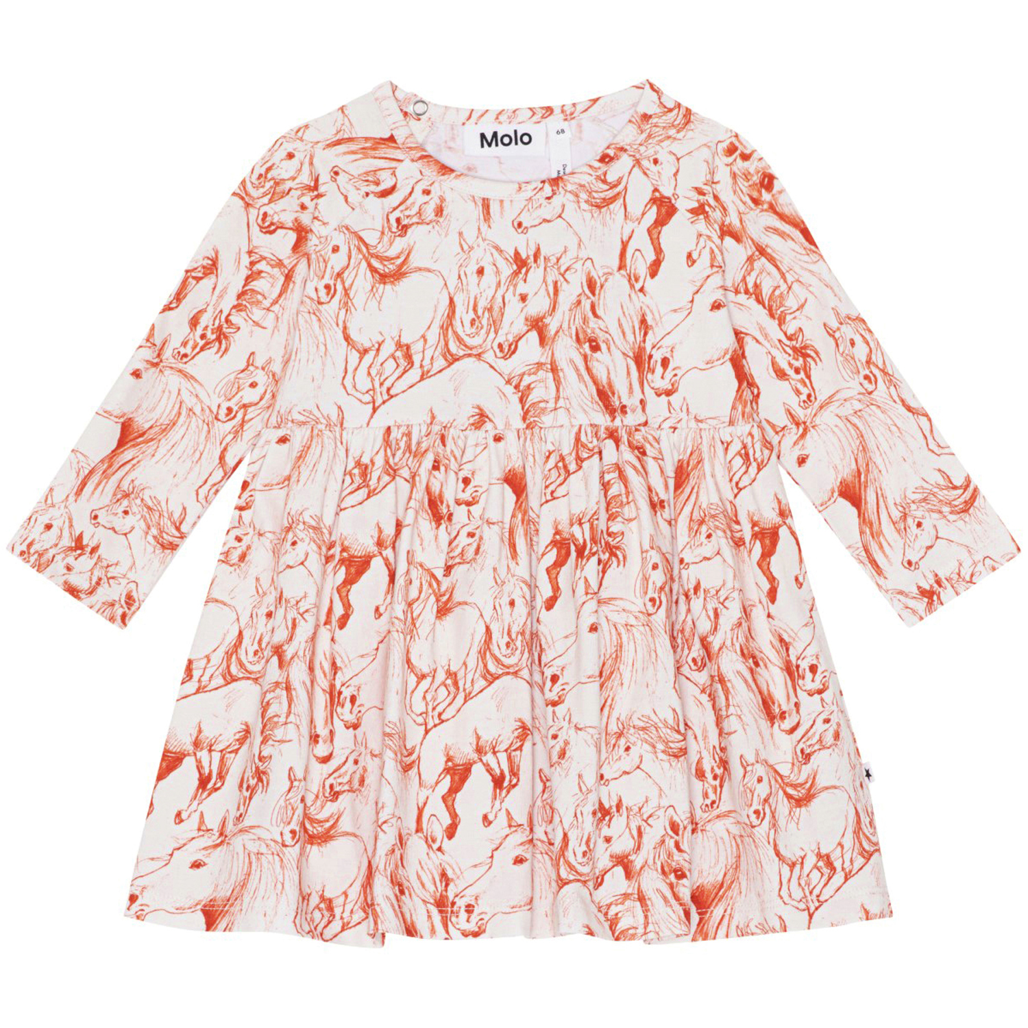 Ekologisk klänning med rött mönster på kjolen, till baby. Mönstret består av röda handteckande hästar. Klänningen har en rund hals, tryckknappar, långa ärmar och rundad kjol.