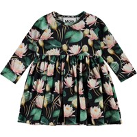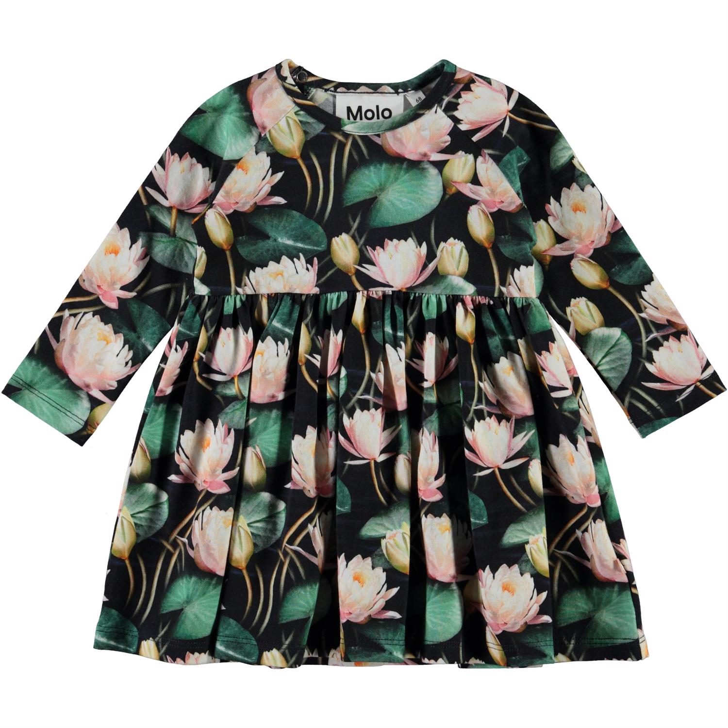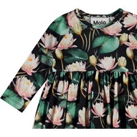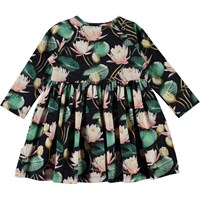 Charmaine är en babyklänning med ett tryck av rosa näckrosor. Klänningen har långa ärmar och en kjol med en fin volym.