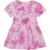 Lila tie-dye klänning till baby i ekologisk bomullsjersey. Klänningen har korta ärmar med gummiband, rund hals och rynkad söm i midjan som ger fin volym till kjolen. Klänningen har en lös passform och är enkel att ta på med tryckknappar vid axeln. Notera att allt vårt tie-dye är handgjort och kan därför variera från plagg till plagg.