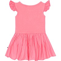 Rosa ekologisk klänning till baby. Klänningens topp är med stretch som säkrar en bra rörelseförmåga. Klänningen har rund hals, korta puffärmar och rundad kjol.