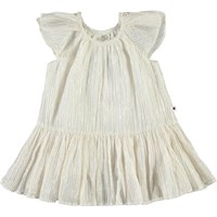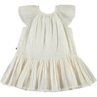Cindie är en vit babyklänning med metalliska ränder. Klänningen har väldigt korta ärmar med knappstängning på axlarna.