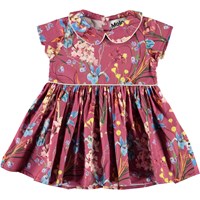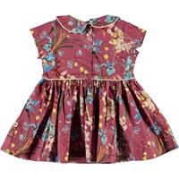 Cinna är en poplinklänning till baby med blommor på. Klänningen har en krage, korta ärmar och en luftig kjol som faller snyggt.
