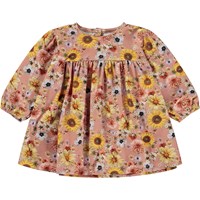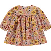 Rosa långärmad babyklänning med blommigt mönster. Klänningen har en rymlig passform, gummiband vid ärmslut och tryckknappar i nacken.