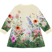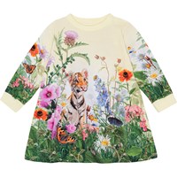 Gul och grön ekologisk sweatshirt klänning till baby. Här ses en nyfiken tigerunge i en färgrik blomsteräng. Klänningen har långa ärmar med ribbkant, ribbkant i halsen och stängs med tryckknappar.