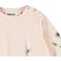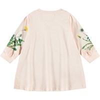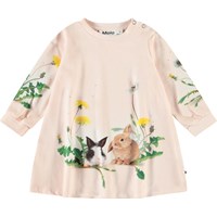 Långärmad klänning för de små i ekologisk bomull. Klänningen är A-linjeformad med en rund halsringning och knappstängning, vilket gör den lätt att ta på. Klänningen är rosa med kaniner och maskrosor.