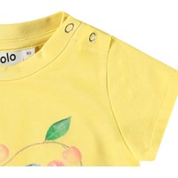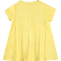 Klänning för de små i ekologisk bomull. Klänningen är A-linjeformad med korta ärmar och en rund halsringning med knappstängning, vilket gör den lätt att ta på sig. Klänningen är gul med små papegojor och körsbär.