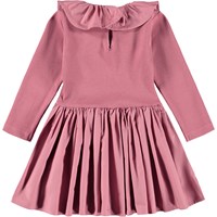Bordeauxfärgad poplindress för de små i ekologisk bomull. Toppen är i ribbad jersey med en söt krage och kjolen är i poplin. Klänningen har en fin knäppning bak för att göra den enkel att ta på och av.