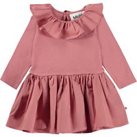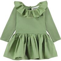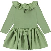 Grön långärmad babyklänning i 100% ekologisk bomull. Klänningen har en söt rund krage som, precis som kjolen är i poplin. Klänningen har tryckknappar i nacken som gör den enkel att ta av och på.