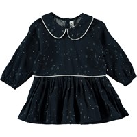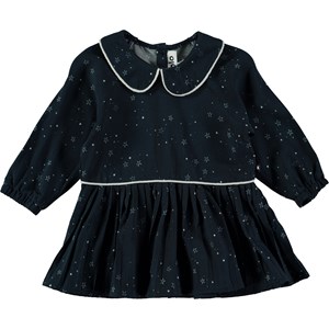 Bedårande, blå klänning med krage, stjärntryck och en fin kjol. Klänningen är lätt att ta av och på, med knappar på ryggen.