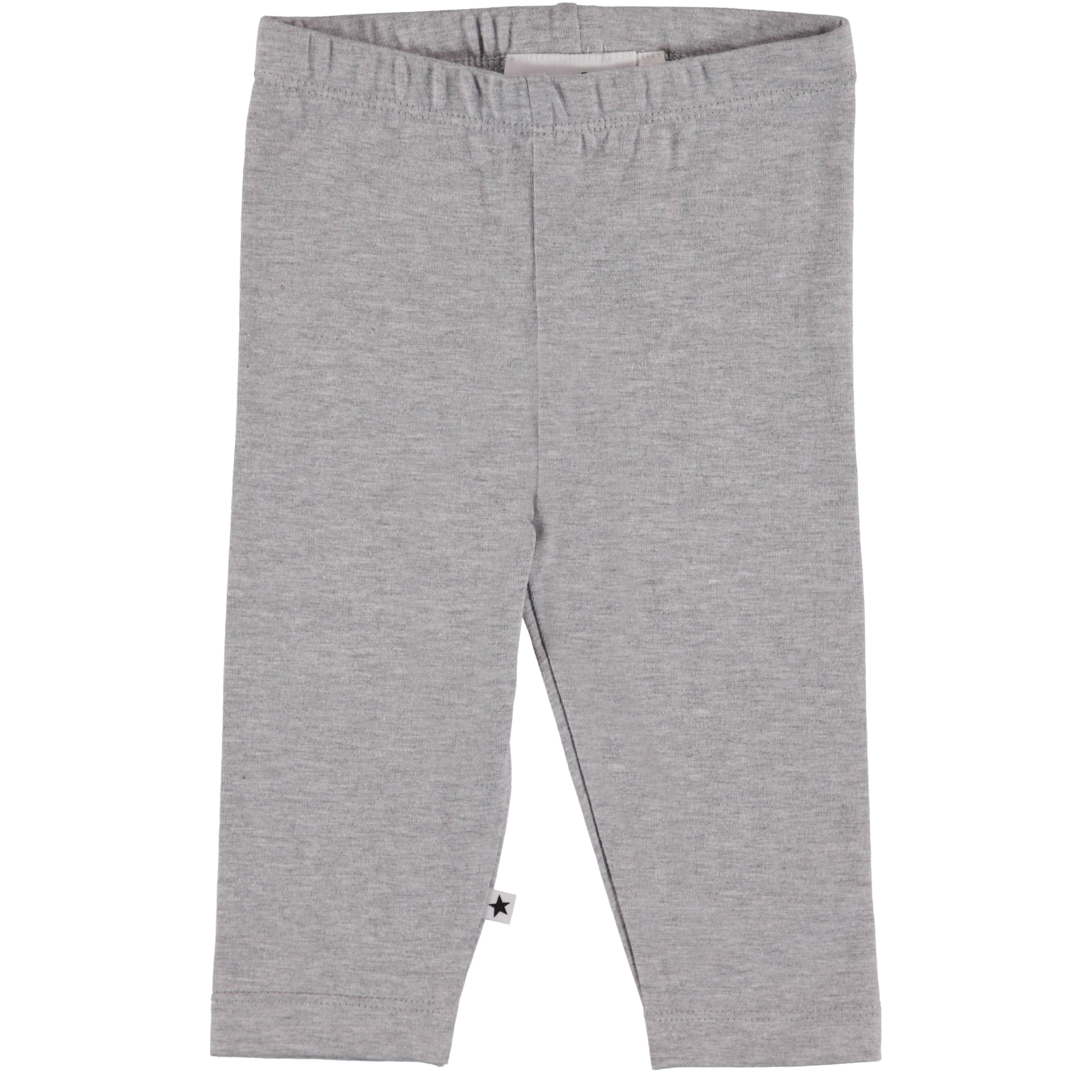 Klassiska, gråmelerade baby leggings. Resåren i midjan och det mjuka materialet ger en skön passform.