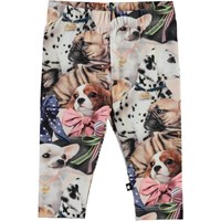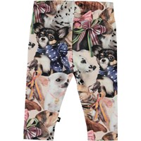 Stefanie är ett par babyleggings med tryck av små hundar med rosetter runt halsen. Den elastiska midjan och det mjuka materialet säkerställer en bra passform.Certifierad av Ecocert Greenlife, certifiering nr. 197496.