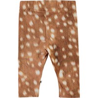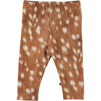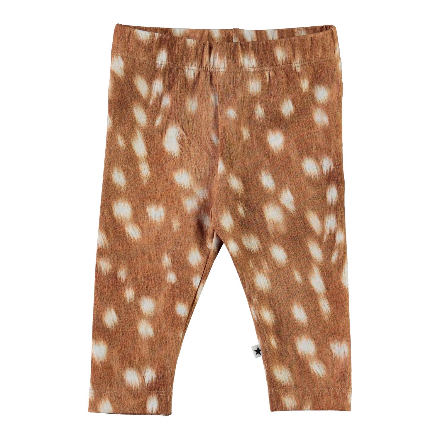 Stefanie är ett par bruna babyleggings med vita fläckar. Den elastiska midjan och det mjuka materialet ger en bra passform.