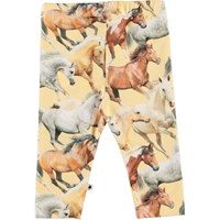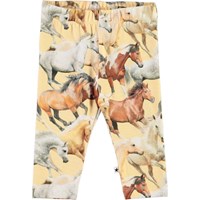 Klassiska ljusgula babyleggings med hästar. Gummibandet i midjan och det mjuka materialet säkrar en bra passform.