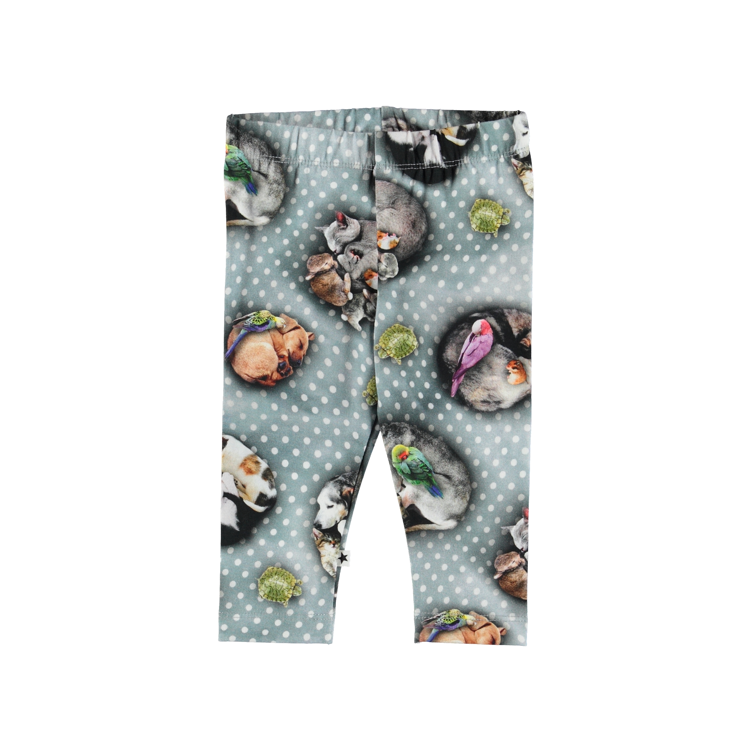 Stefanie är baby leggings med Molo's tryck 'Pets'n Dots'. Resåren i midjan och det mjuka materialet ger en skön passform.