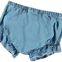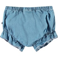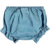Ljusblå bloomershorts i ekologisk bomullschambray för de små. Shortsen har resår i midjan och runt låren, samt delikata volanger vid låren. Perfekt för varma sommardagar.