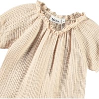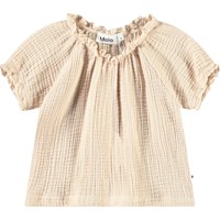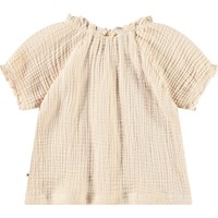 Beige topp i skrynklig ekologisk bomull för de små. Den har korta ärmar, volangkanter längs ärmarna och halsringningen.