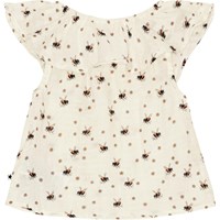 Råvit sommartopp till baby i mjuk ekologisk bomull. Toppen har en lös passform, är utan ärmar och en elastisk hals med påsydd volang som gör den enkel att ta av och på. Toppen har ett sött mönster med små blommor där humlorna flyger omkring. Kombinera toppen med matchande bloomers för ett sött sommarset.