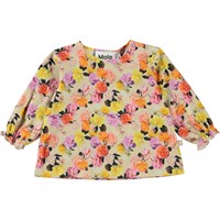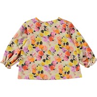 Elina är en multifärgad babytröja i 100% ekologisk bomullsjersey. Tröjan har långa ärmar med små volanger vid handleden och knappar på ena axeln, vilket gör den enkel att ta av och på. Elina är med fina rosor.