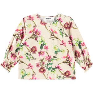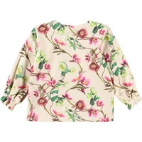 Beige långärmad tröja för de små tillverkad av mjuk ekologisk bomull. Tröjan har en lös passform och ärmar med gummiband vid handlederna, vilket skapar en liten rynkad kant. Det finns också knappar vid axeln, vilket gör det enkelt att ta på och ta av. Blusen har ett heltryck av julrosor i vitt och ljusrosa nyanser, vackert sammanflätade med sina gröna blad.