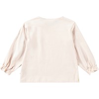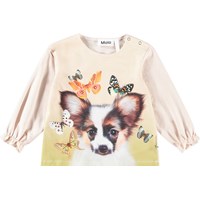 Beige långärmad tröja för de små tillverkad av mjuk ekologisk bomull. Tröjan har en lös passform och ärmar med gummiband vid handlederna, vilket skapar en liten rynkad kant. Det finns också en knappstängning vid axeln, vilket gör den enkel att ta på och ta av. På framsidan av tröjan finns ett tryck av en söt hund omgiven av färgglada fjärilar.