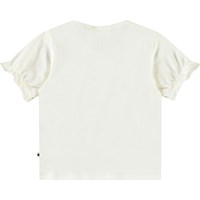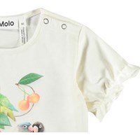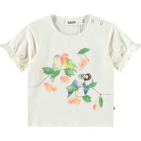 T-shirt för de små i ekologisk bomullsjersey. T-shirten har en lös passform och ärmar med resår i kanten, vilket skapar en liten volang. Det finns en knäppning med knappar på axeln, vilket gör den enkel att ta på och av. T-shirten är vit med små papegojor och körsbär.