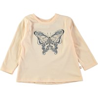 Puderfärgad baby blus med ett sött fjärilbroderi fram. Tryckknappar i halsen gör blusen lätt att få av och på.