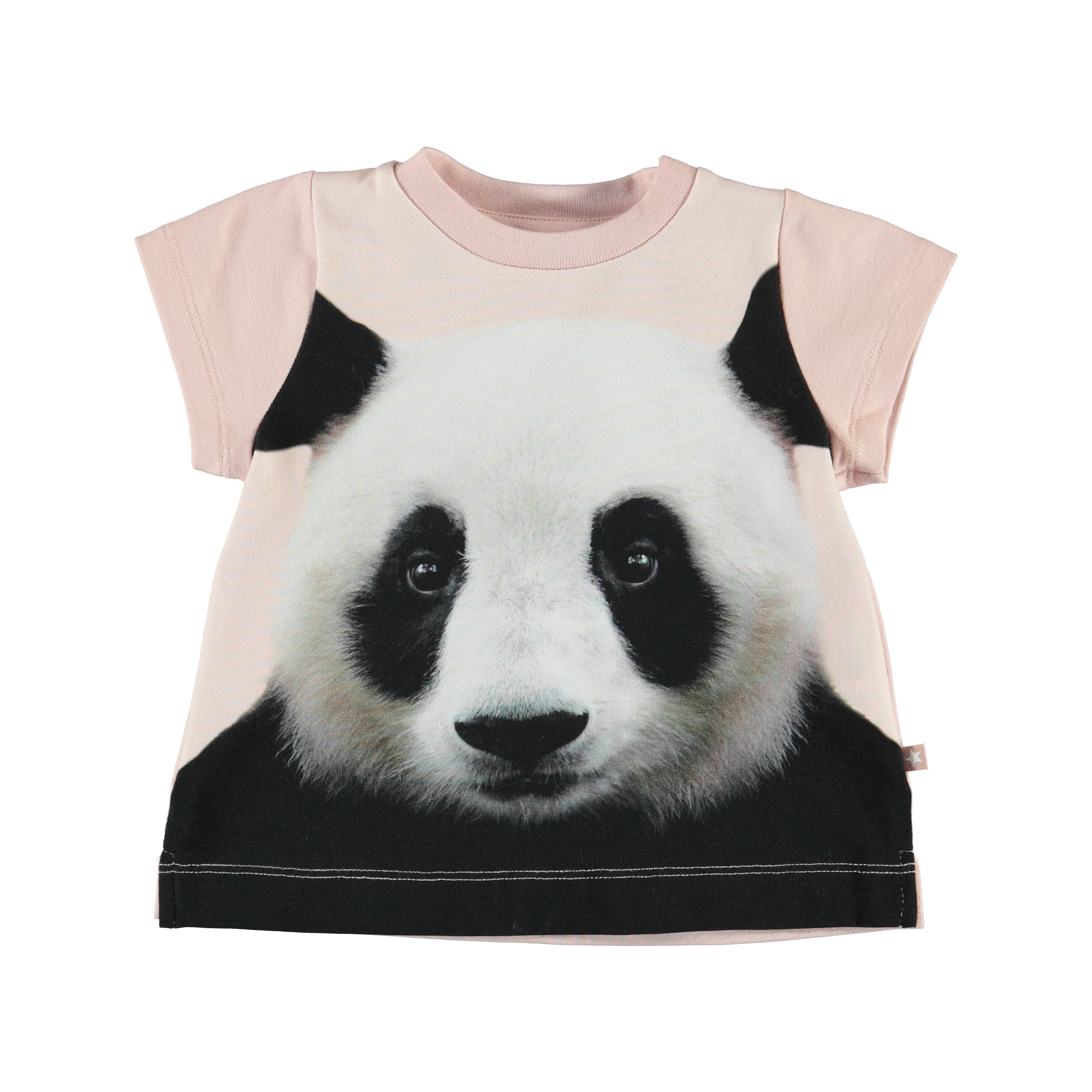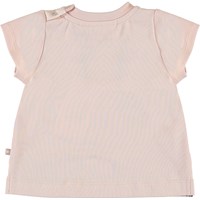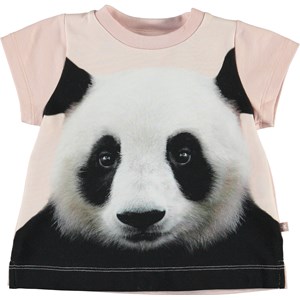 Elly är en ljusrosa baby t-shirt med tryck fram av en baby panda. T-shirten har en tryckknapp på axeln som gör den lätt att ta av och på.