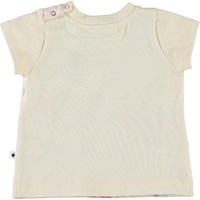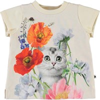 Elly är en beige baby-t-shirt med blommor och en kattunge.