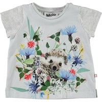 Elly är en ljusgrå t-shirt till baby med ett tryck på en igelkott och många vackra vilda blommor.