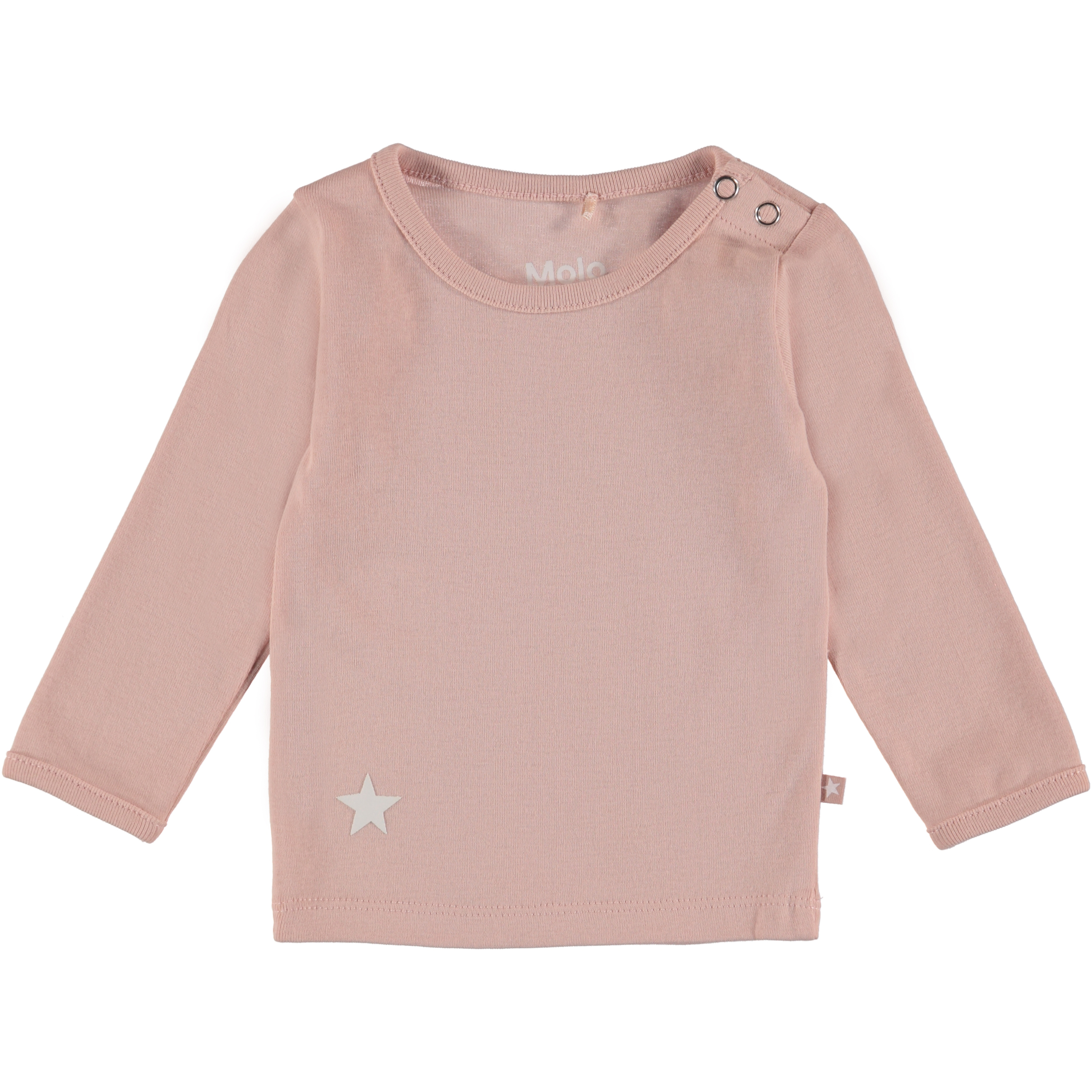 Rosa basis blus till baby med en liten tryckt stjärna nedtill. Tryckknappar vid halsen gör blusen lätt att ta av och på.