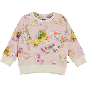 Elsa är en rosa babytröja som har ett tryck av glassar på. Elsa har raglanärmar och en tryckknapp i nacken som gör det enkelt att ta av och på tröjan.