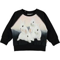 Elsa är en svart babytröja med ett tryck av söta kaninungar framtill. Elsa har raglanärmar och en tryckknapp i nacken, vilket gör tröjan enkel att ta på och av.