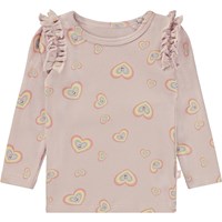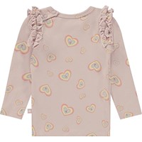 Rosa babytröja med hjärtan. Tröjan har volangkant runt ärmöppningarna och knappar i nacken.