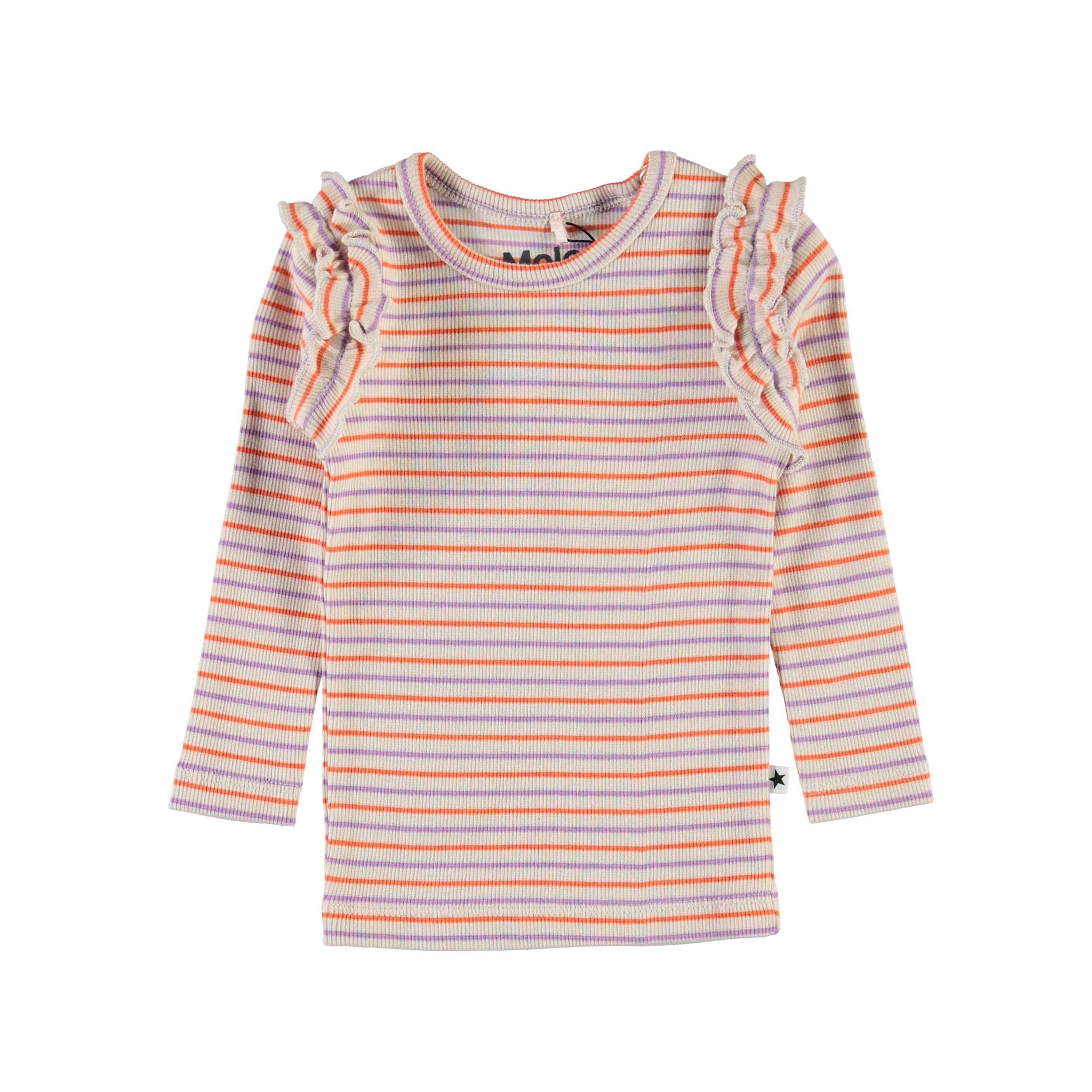 Emma är en ribbad babytröja med beiga, lila och oranga ränder. Tröjan har volanger nedtill och i ärmarna.