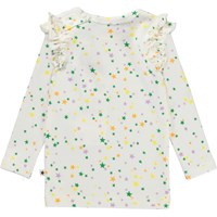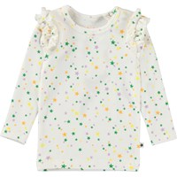 Emma är en vit babytröja med volanger och små stjärnor i olika färger. Tröjan har låga ärmar och volnager vid ärmhålorna och tryckknapp på ena axeln.