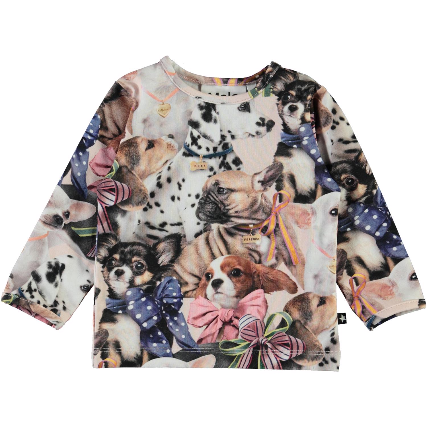 Eva är en babytröja med ett tryck av små hundar med rosetter runt halsen. Tröjan har en knappstängning på ena axeln, vilket gör det enkelt att ta av och på tröjan.