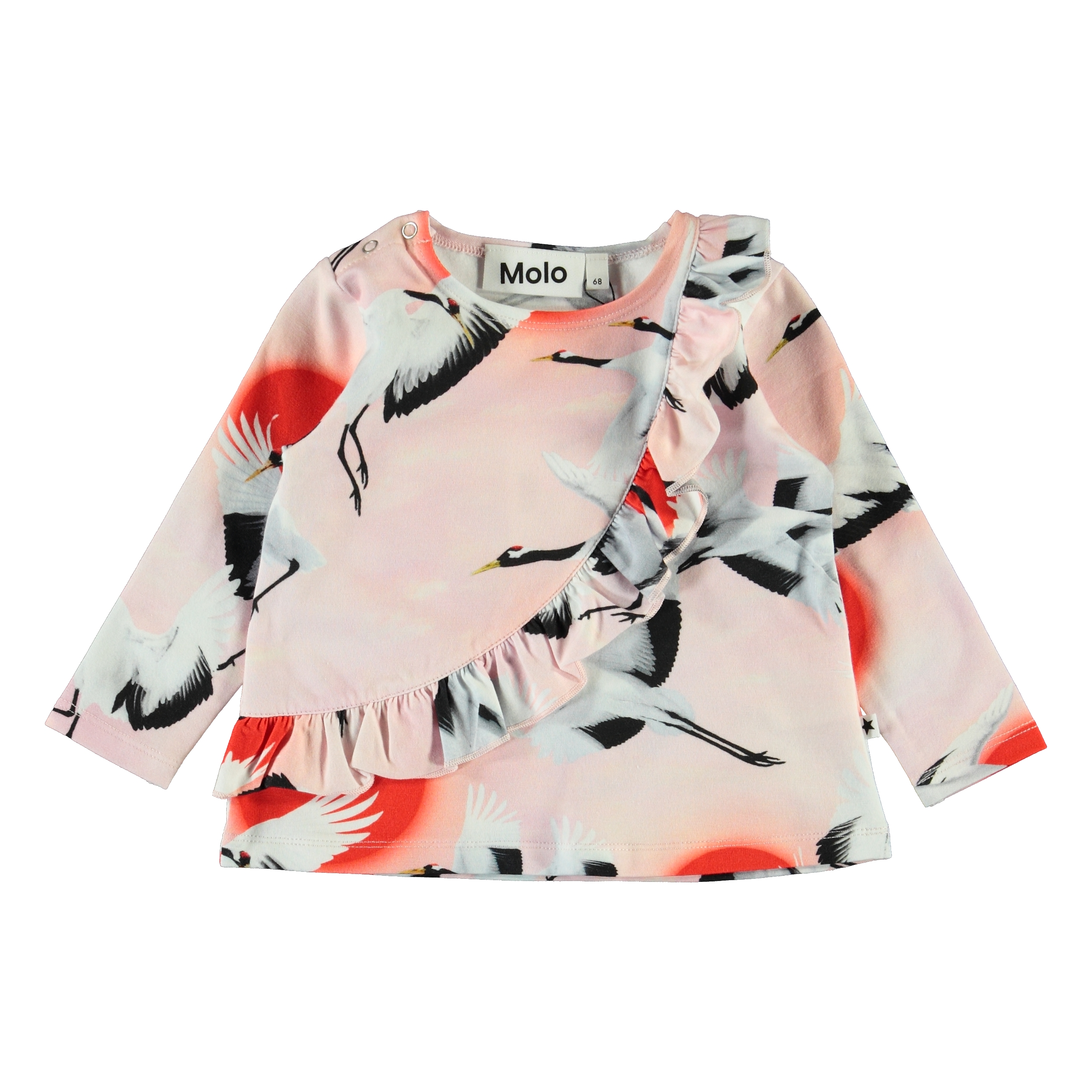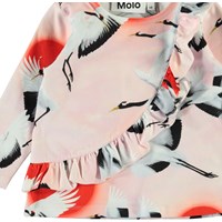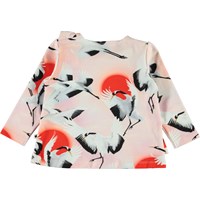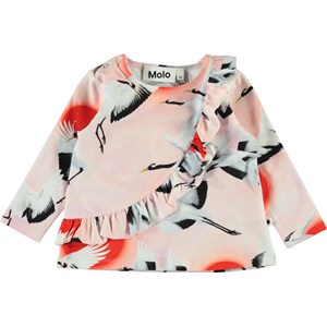 Evelyn är en ljusrosa babytröja med flygande tranor på. Tröjan har långa ärmar, samt en volangkant framtill.