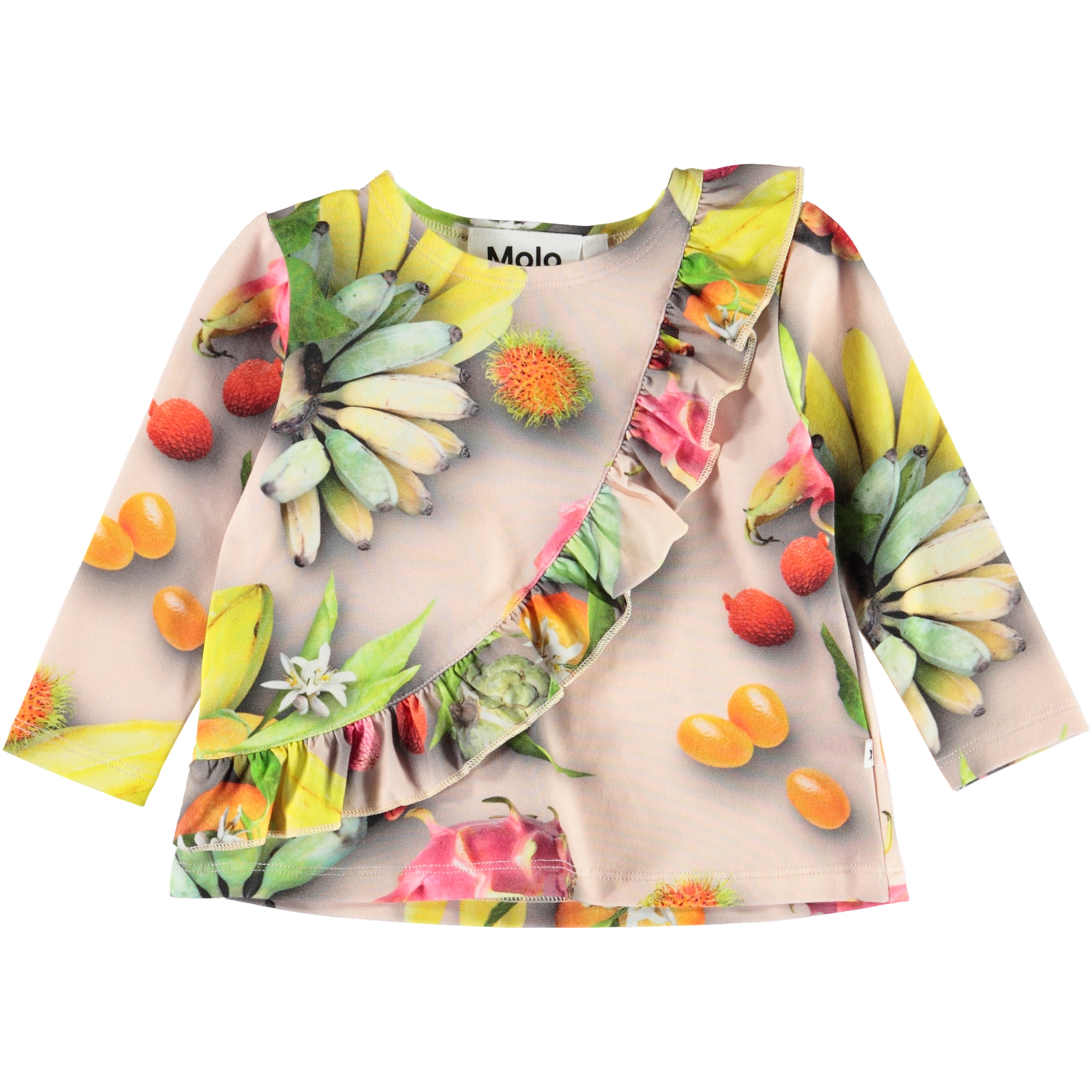 Evelyn är en baby blus i ljusrosa med all-over tryck av tropiska frukter. Blusen har långa ärmar och en snedställd volangkant framtill på blusen.