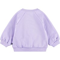 Ljuslila kofta för de små i ekologisk bomull. Koftan har raglanärmar, tryckknappar och volanger framtill. Koftan har ribbade kanter runt halsen, ärmsluten och nederkanten.