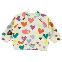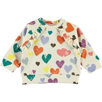 Dayna är baby sweatshirt fylld med kärlek i form av flerfärgade hjärtan. Dayna har raglanärmar med volanger, samt ribb vid hals, nederkant och ärmslut.